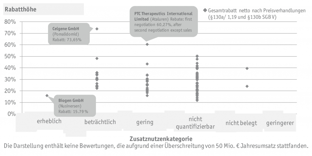 Bei Orphan Drugs gilt der Zusatznutzen bereits mit der Zulassung als belegt und alle untersuchten Verfahren erzielten somit mindestens einen nicht quantifizierbaren Zusatznutzen. Die verhandelten Rabatte (§§130 a und 130 b, netto) lagen in einer heterogenen Spanne von etwa 10% bis 70 % mit einem Median von 26 %. In der Analyse konnte keine Korrelation zwischen dem Zusatznutzen und den verhandelten Rabatten erkannt werden. Begründbar ist dies durch die weiteren Einflussfaktoren im Preisverhandlungsprozess, wie bspw.