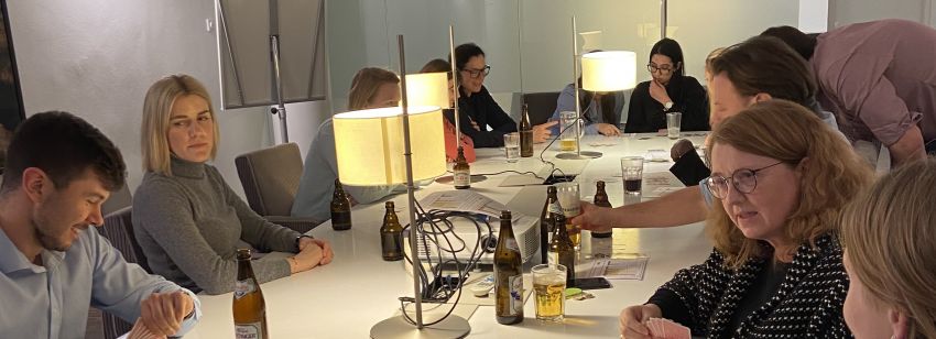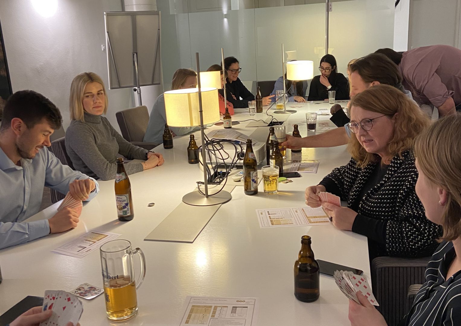 Das Thema Strategie fand sich nun in etwas anderer Form in der selbsterklärenden Eventreihe Learning by Drinking wieder. An diesen Abenden schaut das Team mit wechselnder Verantwortlichkeit ebenfalls über den Tellerrand – allerdings in anderer Manier. Der auch seitens Geschäftsführung lang herbeigesehnte Doppelkopfabend war wie erwartet ein voller Erfolg. Nach kurzer Einführung und Anleitung durch Ingo Hantke war der Abend ein Selbstläufer: Es wurde über Taktiken diskutiert und der Fachjargon, wenn auch bei Neulingen etwas ironisch, ausgiebig genutzt. Am Ende des Abends waren etliche Karlchen und Füchse gefangen und man war sich schnell einig was folgen muss: eine baldige Wiederholung.