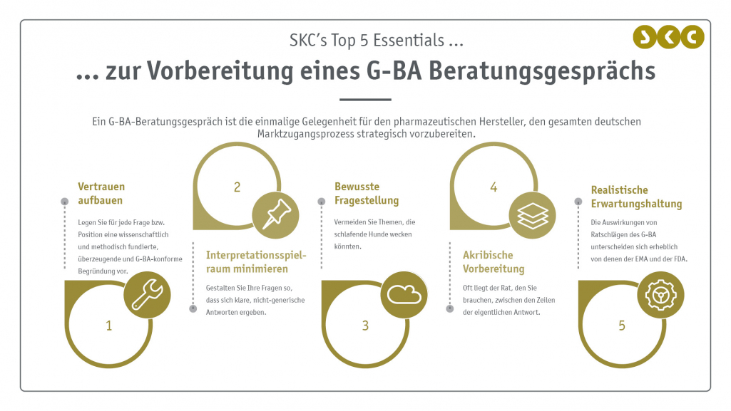 Die SKC Beratungsgesellschaft unterstützt Klienten umfassend und zugleich maßgeschneidert strategisch und operativ, um das optimale Ergebnis zu erzielen. Nach einer umfassenden Analyse der Situation des Klienten, bringt der Blick über den Tellerrand bei der Abwägung der optimalen Auswahl der gestellten Fragen für den G-BA oft weitere Chancen für den Gesamtprozess. Zudem sind neben dem Inhalt, auch die Tonalität und die Formulierungen entscheidend. Die SKC Beratungsgesellschaft führt zumeist ein G-BA-Beratungsgespräch im Rahmen der Unterstützung des vollumfänglichen deutschen Market Access durch und nutzt auf diese Art entstehende Synergieeffekte für den Gesamterfolg des Projekts.