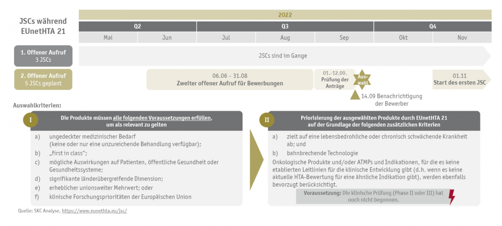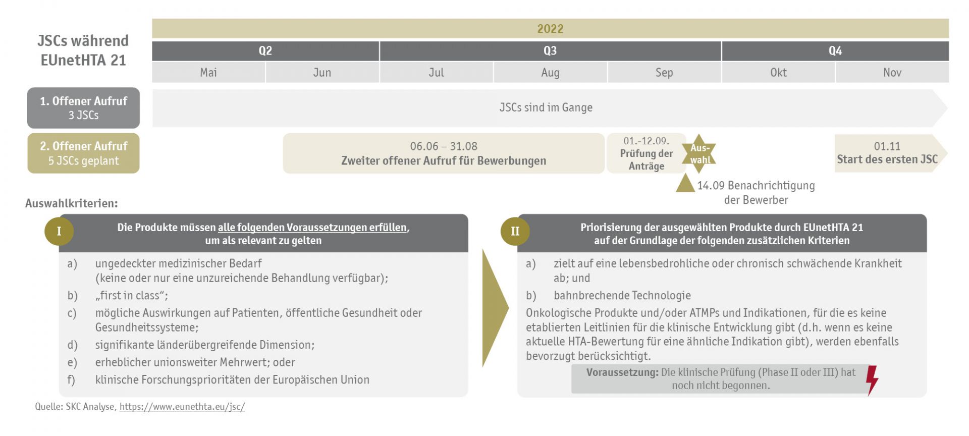 Bis die Verordnung umgesetzt ist, ist das EUnetHTA 21-Konsortium damit beauftragt, bis September 2023 sechs bis acht gemeinsame Beratungsgespräche (Joint Scientific Consultations (JSC)) durchzuführen. Drei Arzneimittel wurden bereits für ein Beratungstreffen ausgewählt und ihre JSCs laufen derzeit. Der zweite offene Aufruf zur Einreichung von Bewerbungen für die verbleibenden maximal fünf JSCs beginnt am 6. Juni 2022 und endet am 31. August 2022.
