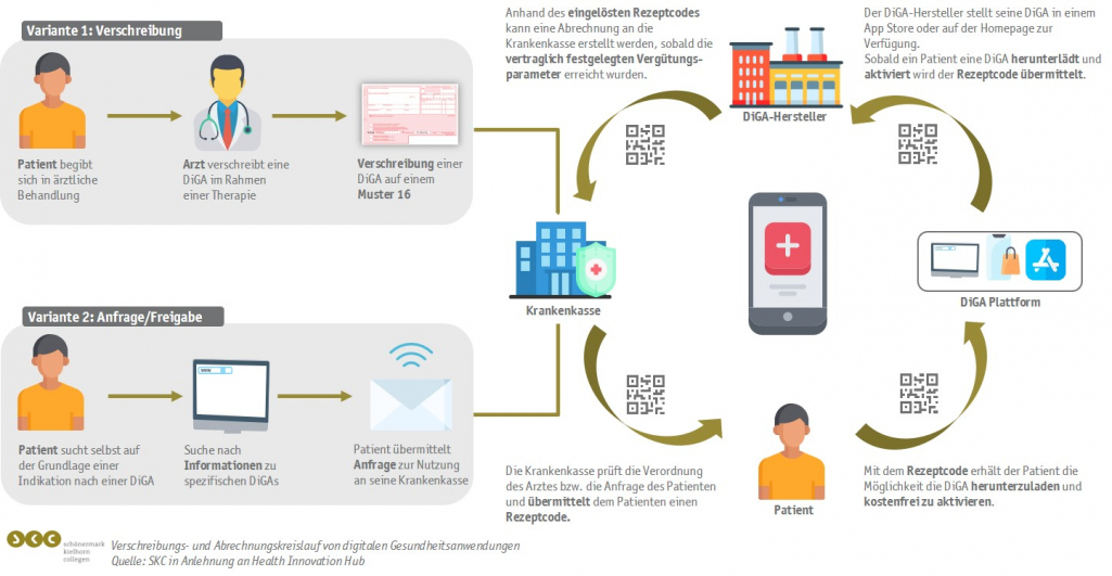 Nach dem derzeitigen Vorgehen erhält der Patient vom Arzt ein Rezept zur Verordnung einer DiGA mit einer dazugehörigen Pseudo-PZN, welches der Patient an seine Krankenkasse weiterleitet. Die Verordnung bezieht sich jeweils auf eine spezifische DiGA eines bestimmten Herstellers. Die Möglichkeit einer Verordnung von „DiGA-Klassen", sodass der Patient aus einer Reihe DiGAs unterschiedlicher Hersteller wählen kann, ist bislang gesetzlich nicht vorgesehen. Neben der ärztlichen Verschreibung können sich Patienten auch mit einer Anfrage direkt an die jeweilige Krankenkasse wenden. DiGAs sind somit nicht zwingend verschreibungspflichtig, jedoch muss der Patient seiner Anfrage einen entsprechenden Nachweis einer medizinischen und ärztlich festgestellten Indikation beilegen. In beiden Fällen erstellt die Krankenkasse einen Rezeptcode, über welchen der gesamte Aktivierungs- und Abrechnungsprozess der DiGA abgewickelt wird. Auch hier können viele der Krankenkassen auf bereits implementierte Prozesse zurückgreifen, da die Freischaltung über zugesandte Codes bereits bei den meisten Versicherten-Apps erfolgreich genutzt werden. Zusammen mit dem Rezeptcode erhält der Patient von der Krankenkasse eine Anleitung, die zum einen erläutert von welcher Plattform er die DiGA beziehen kann, sowie ebenfalls weitere Informationen über den Aktivierungsprozess mit dem zugehörigen Rezeptcode. Der entscheidende Prozess in der Bereitstellung der DiGA ist somit nicht das Herunterladen der App, dieses ist zumeist vorher schon in Eigeninitiative des Patienten über einen App-Store oder die Homepage des Herstellers möglich, sondern die Aktivierung mit dem übermittelten Rezeptcode.