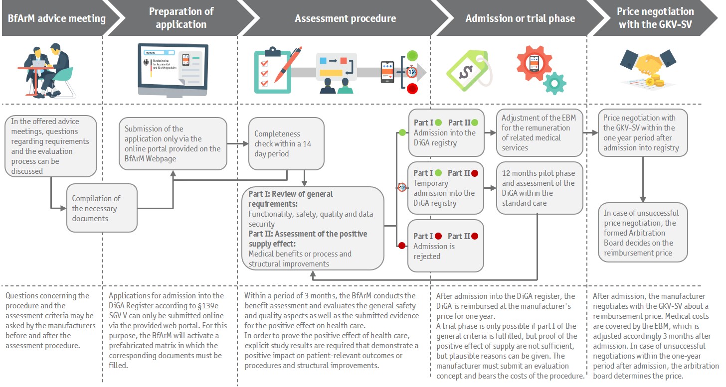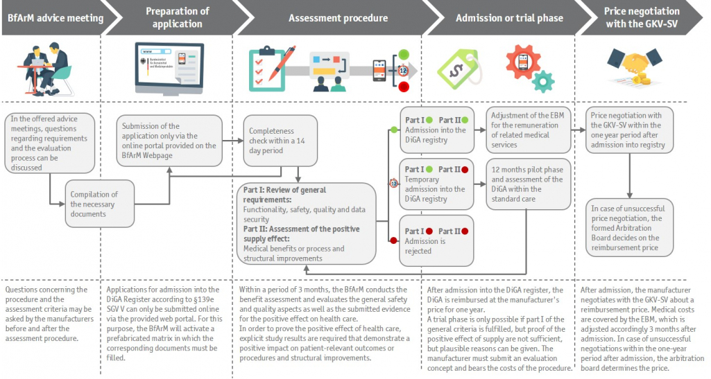 With the "Digital Care Act" (Digitale-Versorgung-Gesetz - DVG), which came into force on December 19, 2019, a new digital service sector was established for the German statutory health insurances, enabling low-threshold access for patients to the so-called "app by prescription" and thus following a participatory approach. In this context, the Federal Institute for Drugs and Medical Devices (BfArM) was assigned the competence to conduct the review process for the nationwide approval of digital health applications (DiGA). The "Fast-Track-Assessment" is associated with important legal requirements and deadlines, whose compliance is a fundamental prerequisite for a comprehensive and compulsory reimbursement by the statutory health insurances in Germany.