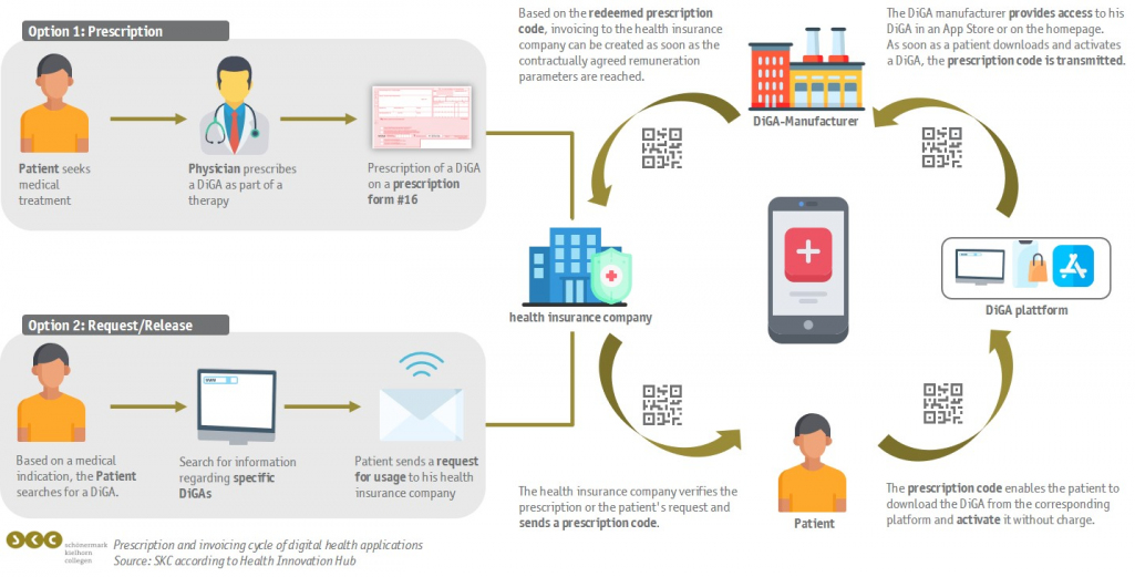 According to the defined procedure, the patient receives a prescription of a DiGA from a physician with an associated pseudo-PZN, which the patient forwards to her/his health insurance company. The prescription always refers to a specific manufacturer- dependent DiGA. The possibility of prescribing "DiGA classes", so that the patient can choose from a range of DiGAs from different manufacturers, has not yet been provided by law. However, patients don't necessarily require a prescription as they could also contact their health insurance company directly. Nevertheless, the patient must enclose appropriate proof of a medical indication with their request. In both cases, the health insurance company creates a prescription code, which is used for the entire activation and invoicing process of a DiGA. Many of the health insurance companies can rely on processes that have already been implemented, as the activation via codes is already being used successfully with most of the insurance apps. Together with the prescription code, the patient receives further instructions from the health insurance company, which explain the downloading and activation process with the corresponding prescription code. The decisive process in the provision of a DiGA is therefore not the actual download of the app, which is usually possible in advance on the patient's own initiative through an app store or the manufacturer's homepage, but the activation with the transmitted prescription code.