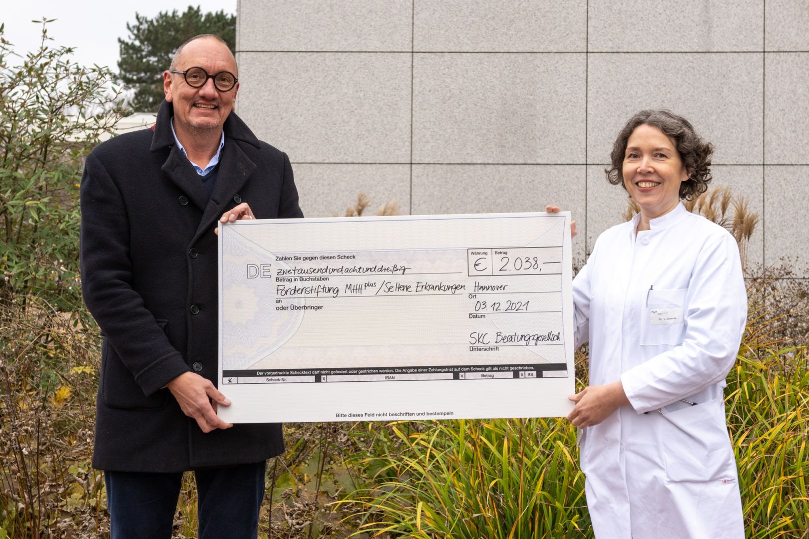 The Center for Rare Diseases of the Hannover Medical School (MHH) was already pleased with a donation from SKC consulting last advent. The managing directors of SKC, Univ. Prof. Dr. med. Matthias P. Schönermark and Heike Kielhorn, had saved the money for the business Christmas cards and donated the budgeted amount to the MHH instead. The symbolic delivery has now taken place together with senior physician Dr. Vega Gödecke. "It is really a great support," said Dr. Gödecke. "On the one hand, this amount enables us to perform a special diagnostic investigation focusing on a current research question, and on the other hand, it supports our offers for the next Rare Disease Day Symposium."